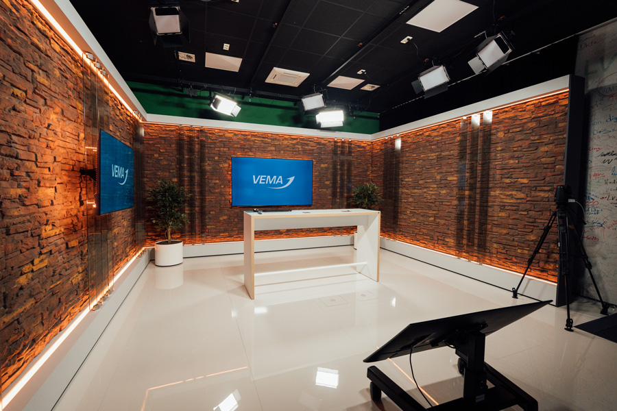 In unserem 73 Quadratmeter großen Studio mit Greenscreen-Kulisse können verschiedene virtuelle Setups gewählt und Videos live gestreamt oder aufgezeichnet werden. Dafür stehen drei High-End PTZ-Kameras von Panasonic, hochwertige Mikrofone, mehrere Referenten-Bildschirme und eine vollausgestattete, räumlich-abgetrennte Regie mit Sichtmöglichkeit ins Studio zur Verfügung.
