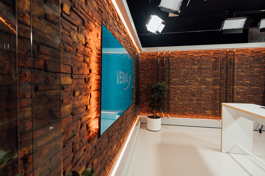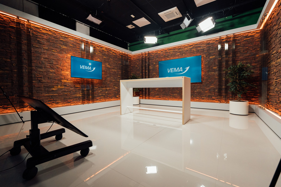 In unserem 137 Quadratmeter großen Studio stehen Ihnen alle Möglichkeiten offen: Sie können entweder die große Greenscreen-Hohlkehle nutzen und sich dort virtuell vor verschiedenste Hintergründe (/ in dreidimensionale Welten) setzen lassen oder die noch größere modulare Realkulisse verwenden. Diese lässt sich entsprechend Ihrer Anforderungen umgestalten, was Farbe, LED-Beleuchtung, Branding und Mobiliar entspricht. Als Kameras werden dort die weltweit ersten Vollformat-PTZ-Kameras mit Wechselobjektiv-System von Sony (FR7) verwendet.